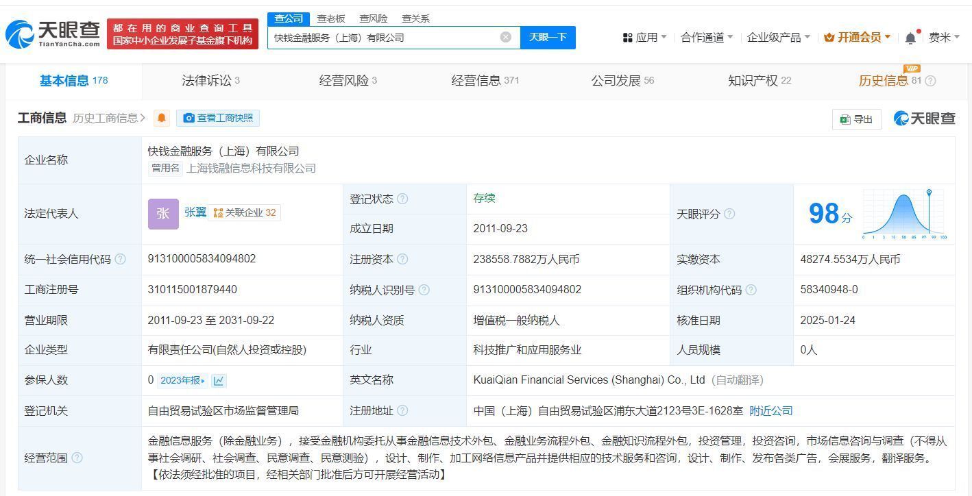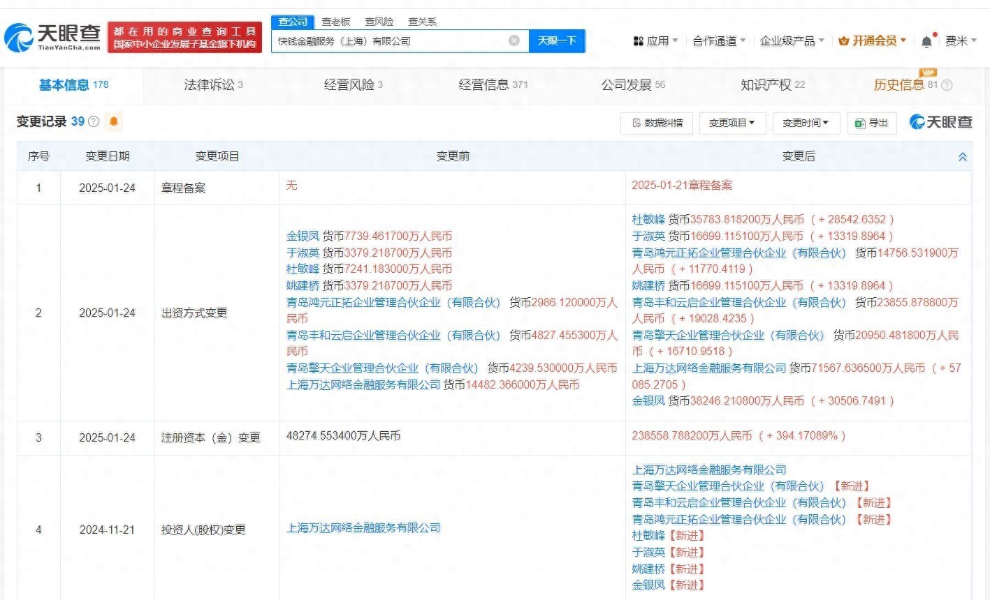 天眼查App显示,近日,快钱金融服务(上海)有限公司发生工商变更,注册资本由约4.8亿人民币增至约23.9亿人民币,增幅约394%。